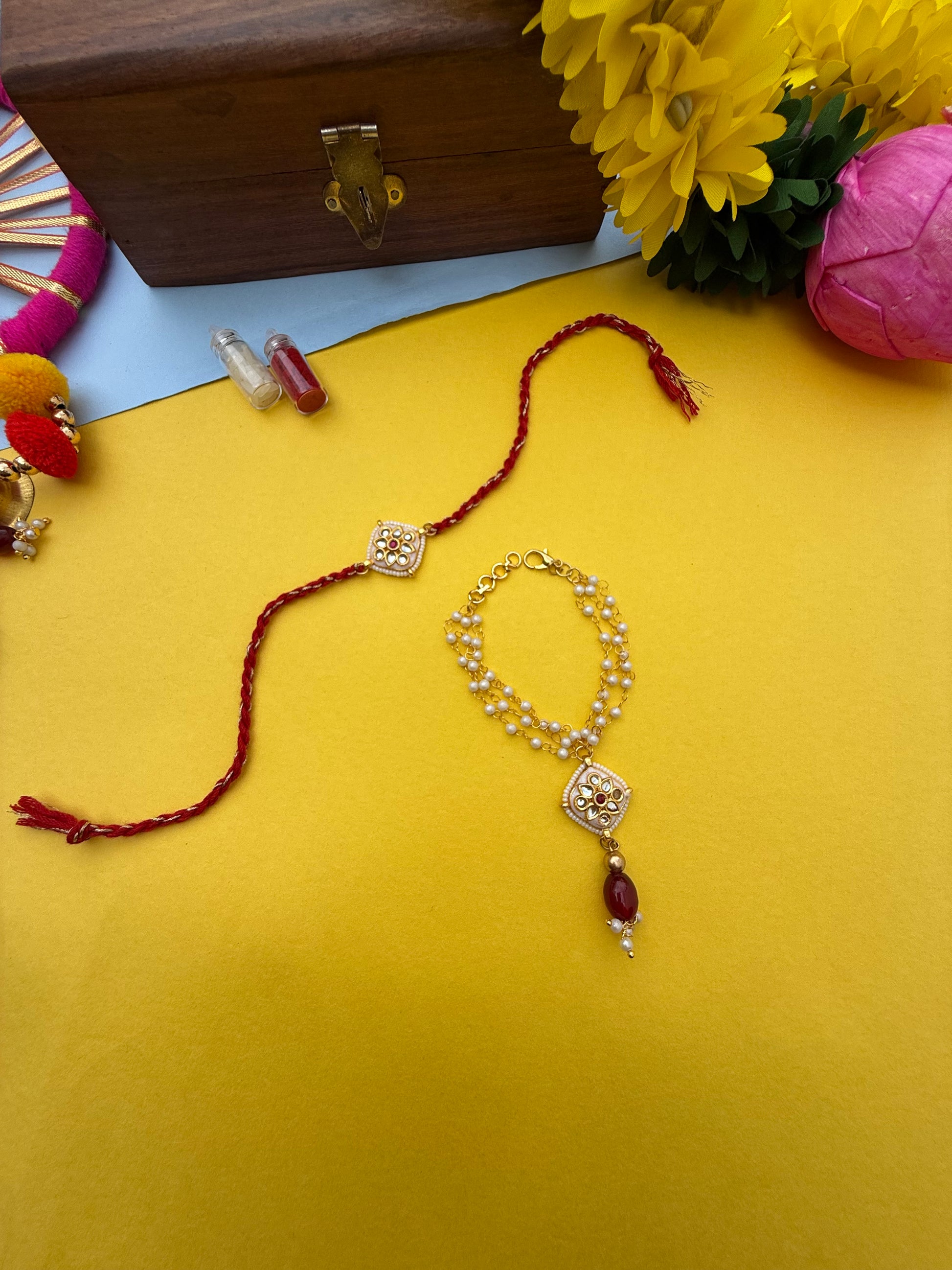 - Kundan Rakhi + Pearl Bhaiya Rakhi + Matching Lumba for Bhabhi