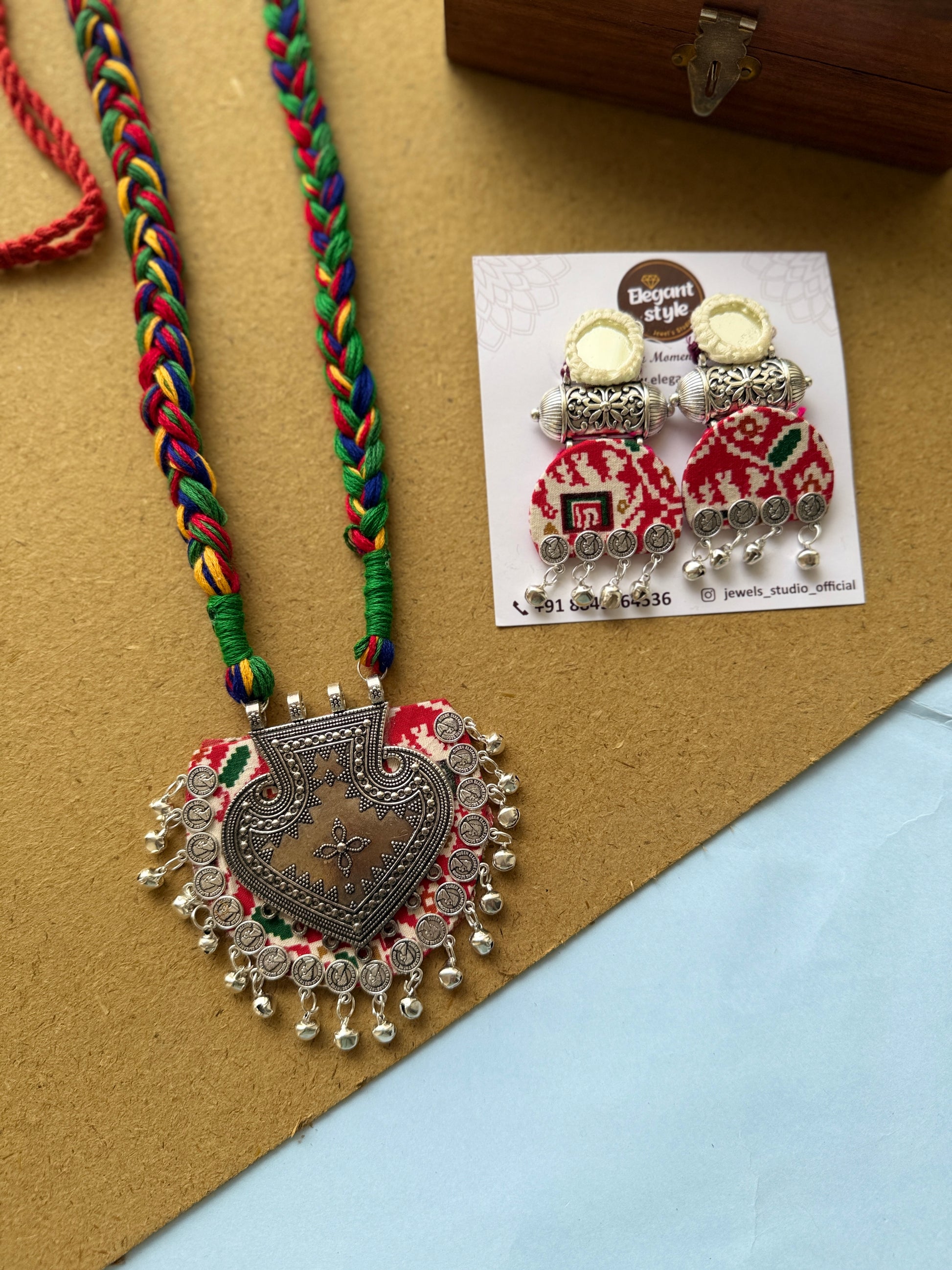 Elegantstyle presents a Fabric Oxidised Premium Long Necklace – a perfect blend of tradition and trend. Handcrafted with fine oxidised elements and soft fabric detailing, this long necklace adds a royal charm to your festive and everyday look. Lightweight, stylish, and versatile – pair it with ethnic or fusion wear for a statement look that stands out.”